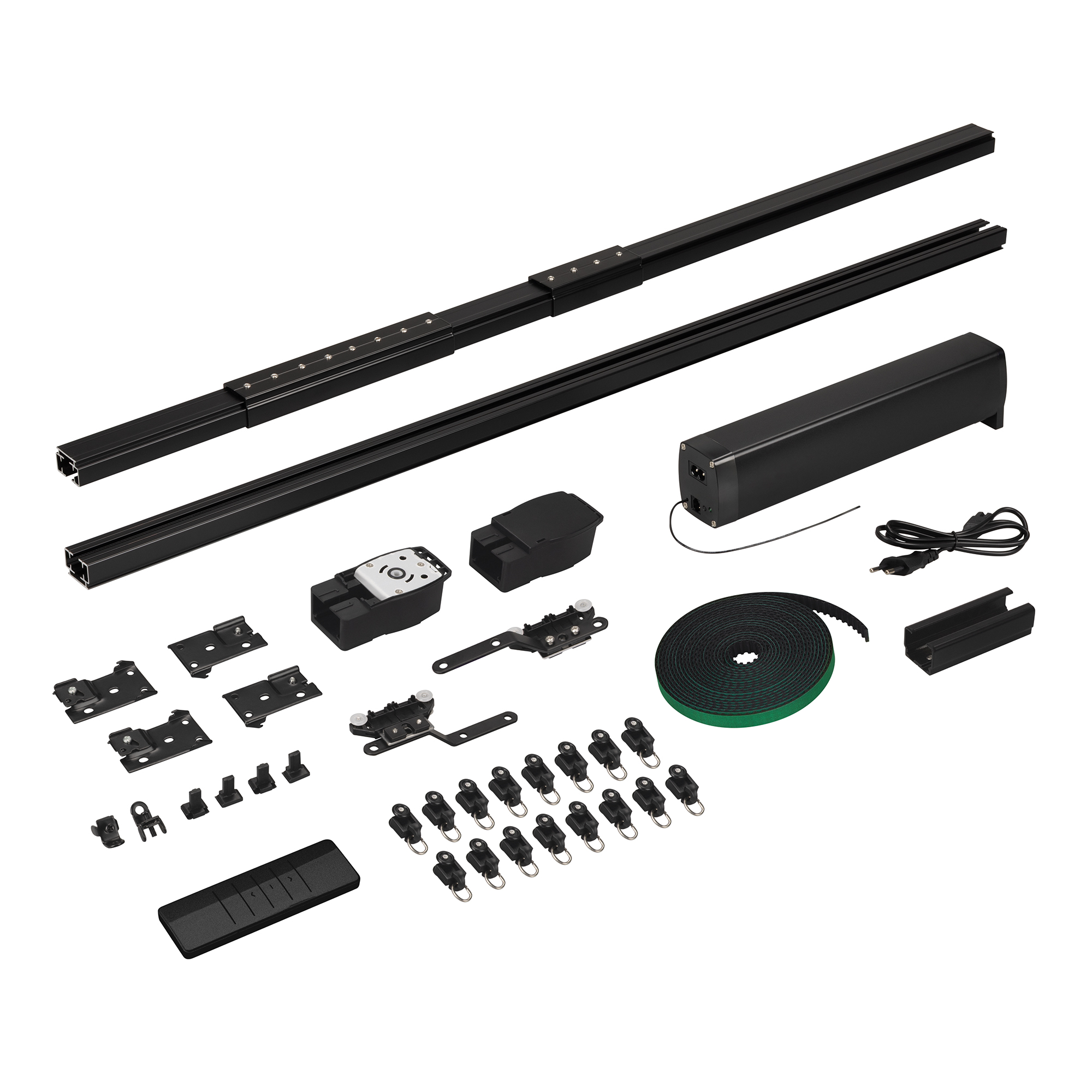 1 мотор, 1 пульт дистанционного управления, алюминиевый профиль 1,6 мм (1м - 1шт, 0.5м - 1шт, 0.2м - 2шт., 0.1м - 1 шт.), 2 соединителя 10 см, 1 соединитель 20 см, 1 переходник 5 см, 2 шкива, 2 пряжки ремня, 2 направляющих бегунка, ремень 4,4 м, 16 бегунков, 2 фиксатора, 4 кронштейна, 1 зажим на ремень