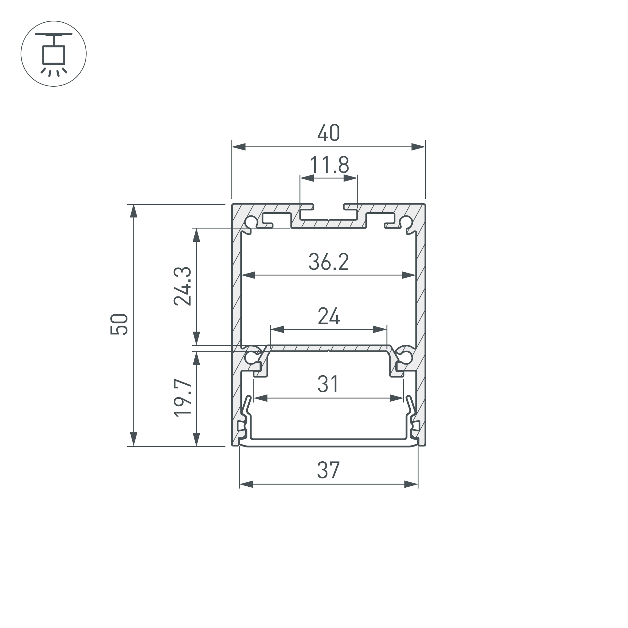 Накладной/подвесной профиль из алюминия черного цвета для основного освещения с возможностью герметизации до IP54 с помощью аксессуаров к профилю без дополнительного использования силиконового герметика, до IP65 с помощью аксессуаров к профилю при условии дополнительного использования силиконового герметика. Габаритные размеры профиля составляют 2000 мм в длину, 40 мм в ширину и 50 мм в высоту. Площадка для установки светодиодных лент позволяет использовать ленту шириной до 24 мм и мощностью до 36 Вт/м. Это обеспечивает гибкость в выборе светодиодных лент и позволяет создать потрясающие световые решения. Экран, заглушки и другие аксессуары не включены в комплект и приобретаются отдельно. Цена указана за 1 метр профиля. Отличное решение для создания современных световых проектов.