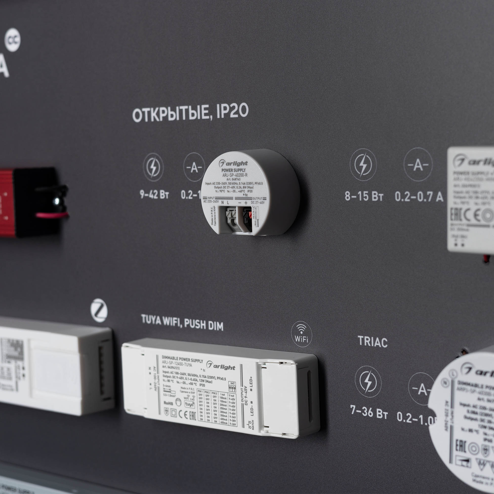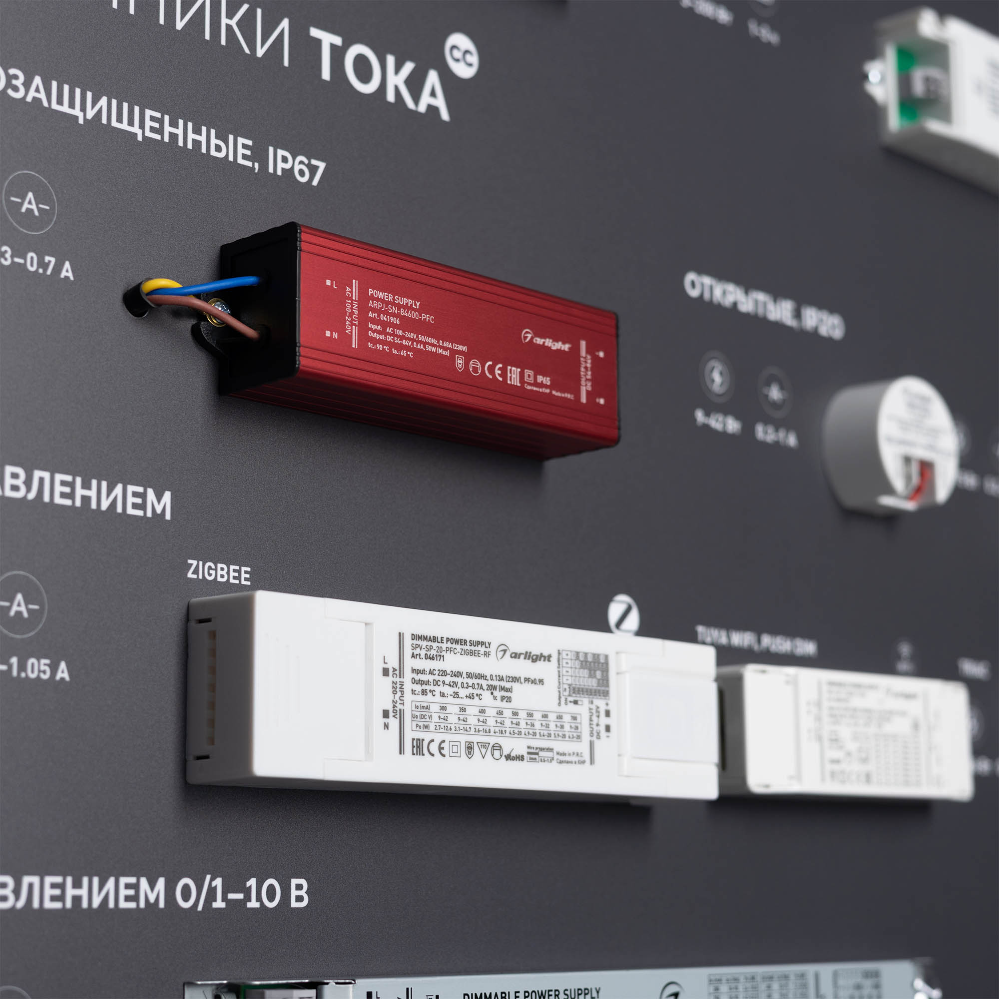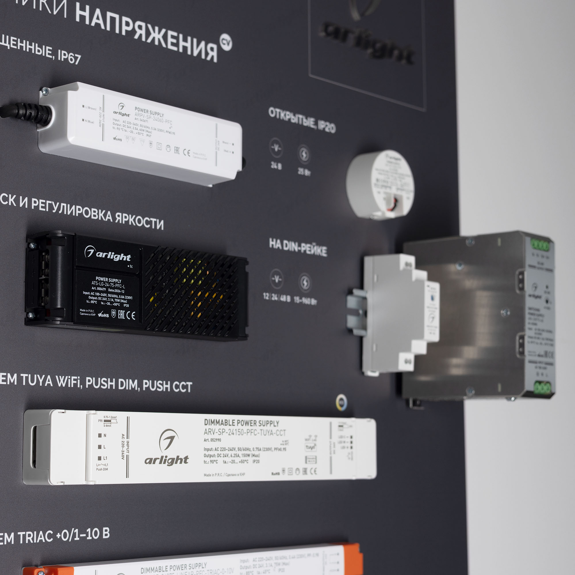 На стенде представлен широкий ассортимент блоков питания Arlight для различных источников освещения: светодиодные ленты, светильники, мощные светодиоды и т. п. Показаны варианты встройки блоков питания в ниши и в профиль. Реализован механизм плавного включения светодиодной ленты.