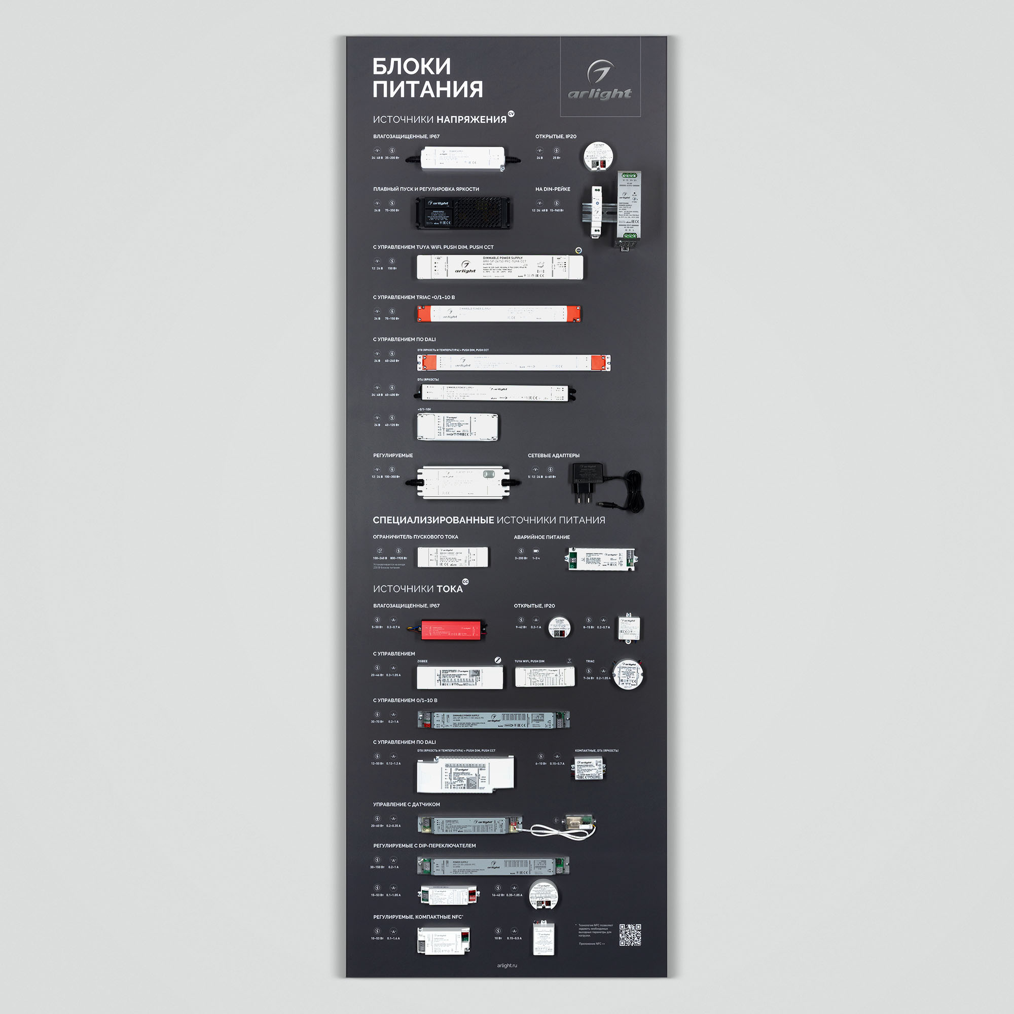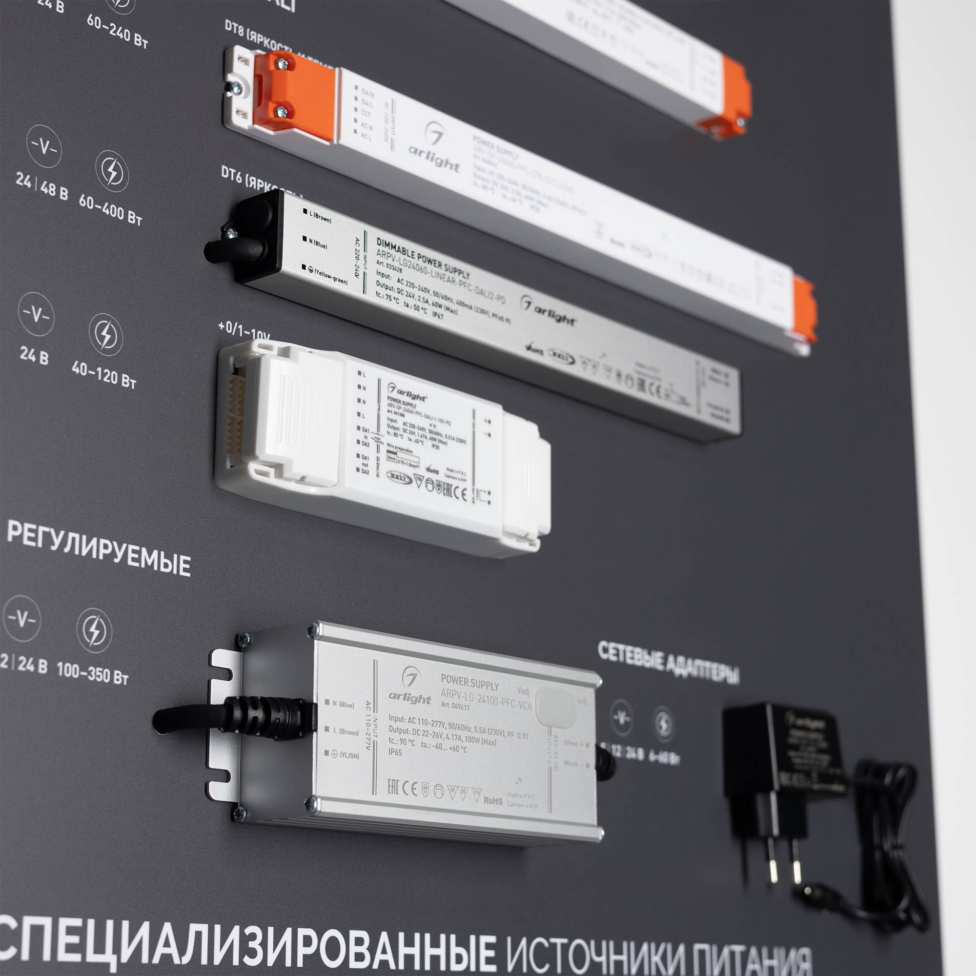 Представлен широкий ассортимент блоков питания Arlight для различных источников освещения: светодиодные ленты, светильники, мощные светодиоды и т. п.