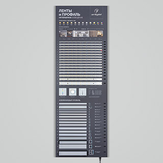 Обзорный стенд по ассортименту светодиодных лент и профилей.