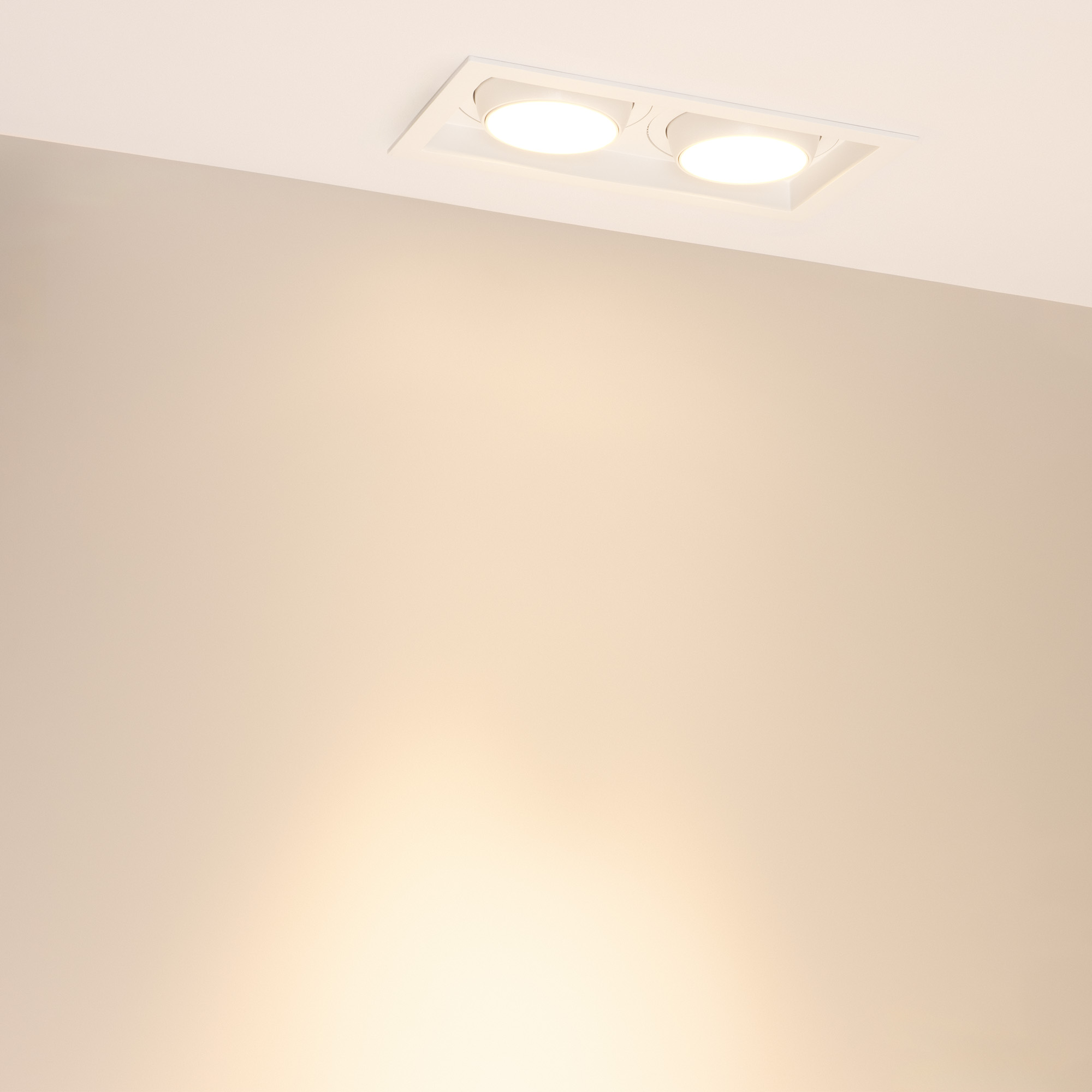 Встраиваемый карданный светильник. Мощность 2х30 Вт, св. поток 6520 лм, 109 лм/Вт, дневной 3000 K, CRI>92, угол 30°, напряжение питания 230 В. Белый корпус из алюминия, степень защиты IP20. Размер: длина 250 мм, ширина 140 мм, высота 125 мм. Монтаж встраиваемый, установочное отверстие: длина 230 мм, ширина 120 мм. Драйвер 24-42 В, 750 мА, пульсация <2%.